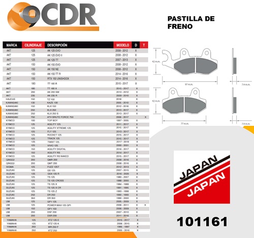 ¡No pongas en riesgo tu seguridad al manejar tu moto o cuatrimoto! Con las pastillas de freno Japan 101161 podrás disfrutar de un frenado seguro y efectivo. Fabricadas con metal de alta calidad, estas pastillas garantizan un óptimo rendimiento y durabilidad. Compatible con una amplia gama de modelos, son la elección perfecta para tu vehículo. ¡No esperes más y asegura tu tranquilidad en cada viaje!
